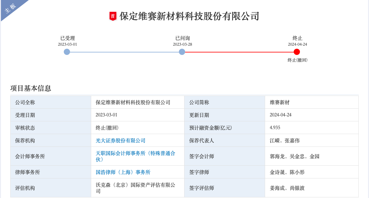 瑞财经 严明会4月24日,据深交所披露,保定维赛新材料科技股份有限公司(以下简称:维赛新材)撤回申请,主板IPO已终止。该项目由光大证券保荐,保荐代表人江嵘、张嘉伟。