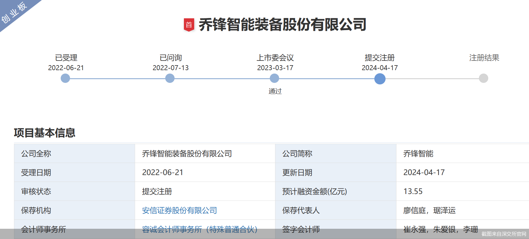 从2022年6月招股书获受理至今,乔锋智能装备股份有限公司(以下简称“乔锋智能”)创业板IPO已经等待了近两年时间。近期,乔锋智能向证监会提交了注册申请,公司IPO进入最后冲刺阶段。不过,冲击“注册关”背后,乔锋智能销售服务商疑点较多,公司2023年上会时相关问题也曾被监管询问。注册阶段,上述问题会否再度遭到证监会深度追问,也引发市场关注。