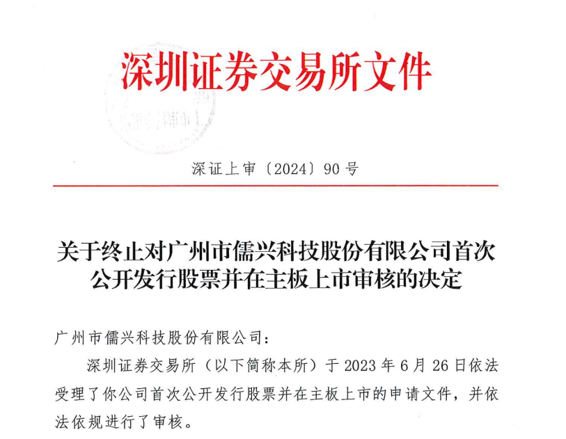 瑞财经 李兰4月23日,深交所决定终止对广州市儒兴科技股份有限公司(以下简称“儒兴科技”)首次公开发行股票并在主板上市审核,保荐人为中信证券股份有限公司。