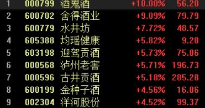 5月6日,白酒板块持续走强,截至发稿,酒鬼酒涨停,舍得酒业涨超9%,水井坊涨超7%,泸州老窖、古井贡酒等涨超5%,五粮液、洋河股份等涨超4%。