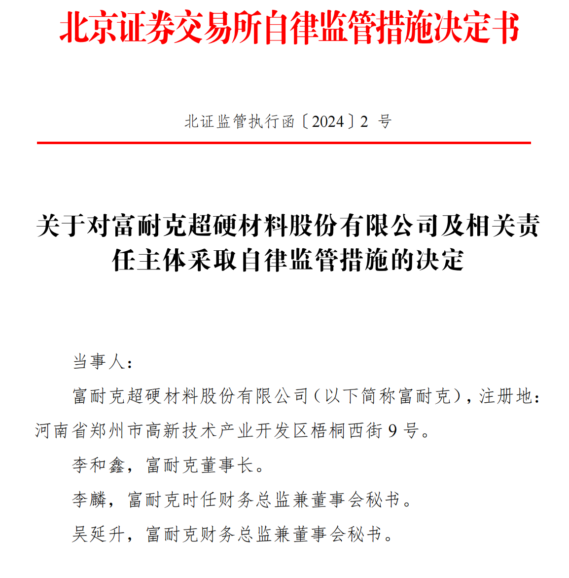 瑞财经邓如菲4月30日,北京证券交易所发布关于对富耐克超硬材料股份有限公司(以下简称“富耐克”)及相关责任主体采取自律监管措施的决定。