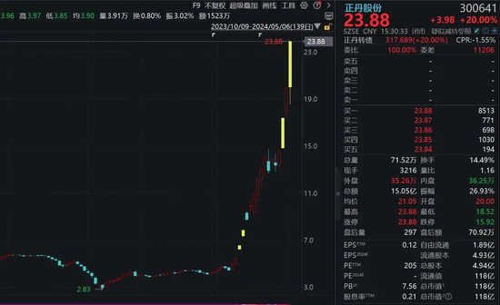 在4月1日至5月6日的21个交易日里,正丹股份股价从4.32元/股涨至23.88元/股,其间涨幅高达454.06%。