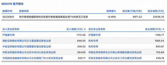 龙虎榜丨首开股份今日跌停,机构合计净卖出1979.41万元
