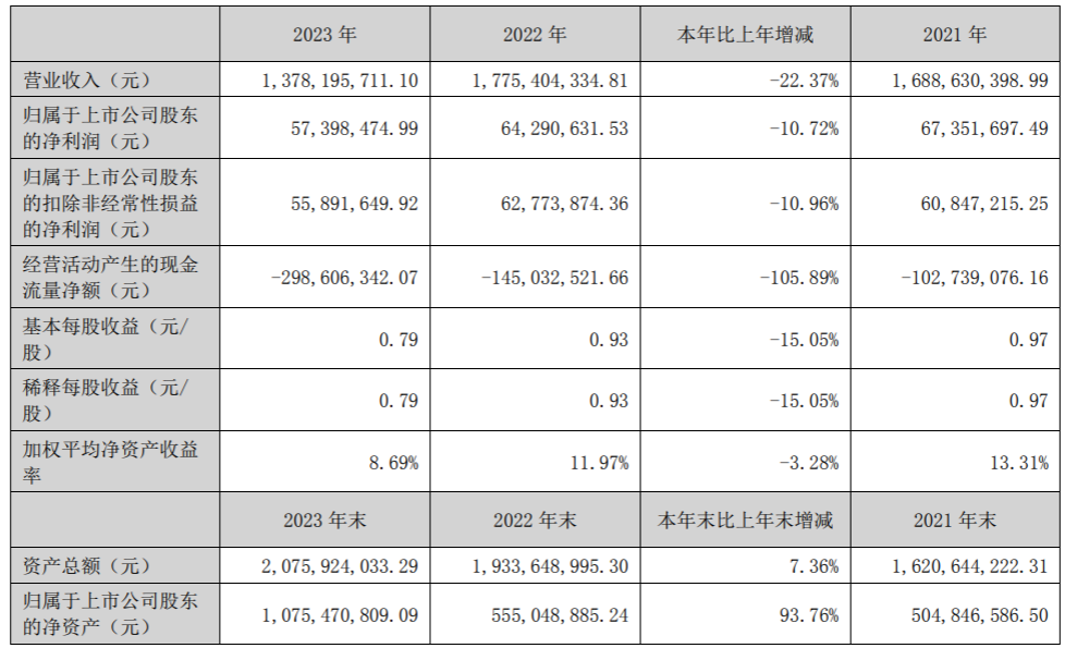 2023年(下称报告期内),惠柏新材实现营业收入13.78亿元,同比下降22.37%,实现归属上市公司股东净利润5739.85万元,同比下降10.72%。