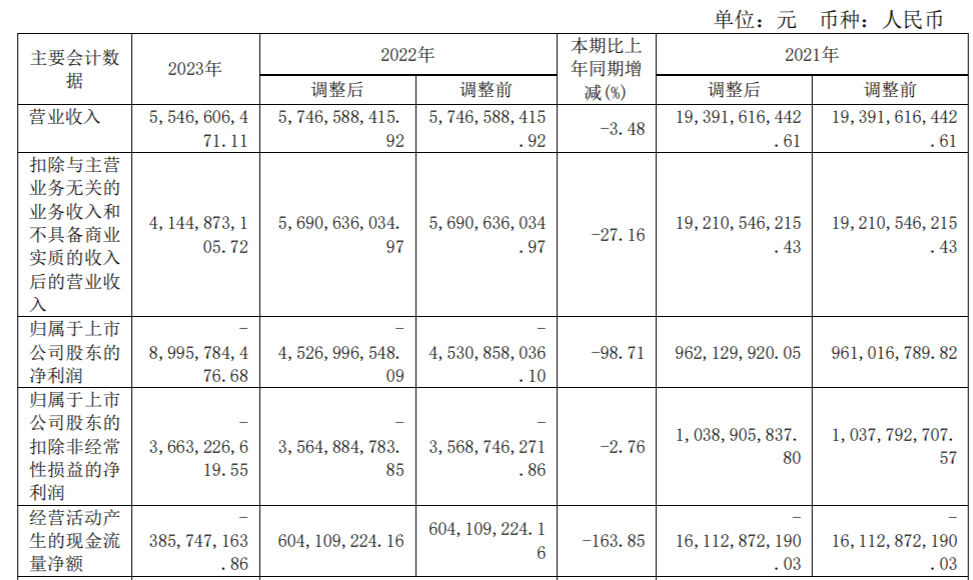 2023年,公司实现综合毛利润21.29亿元,同比增加52.45%,净利润-144.42亿元,同比减少97.82%,归属于上市公司股东净利润-89.96亿元,同比减少98.71%。