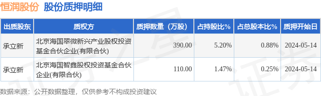 证券之星消息,恒润股份(603985)5月15日公开信息显示,股东承立新向北京海国翠微新兴产业股权投资基金合伙企业(有限合伙)、北京海国智鑫股权投资基金合伙企业(有限合伙)合计质押500.0万股,占总股本1.13%。质押详情见下表: