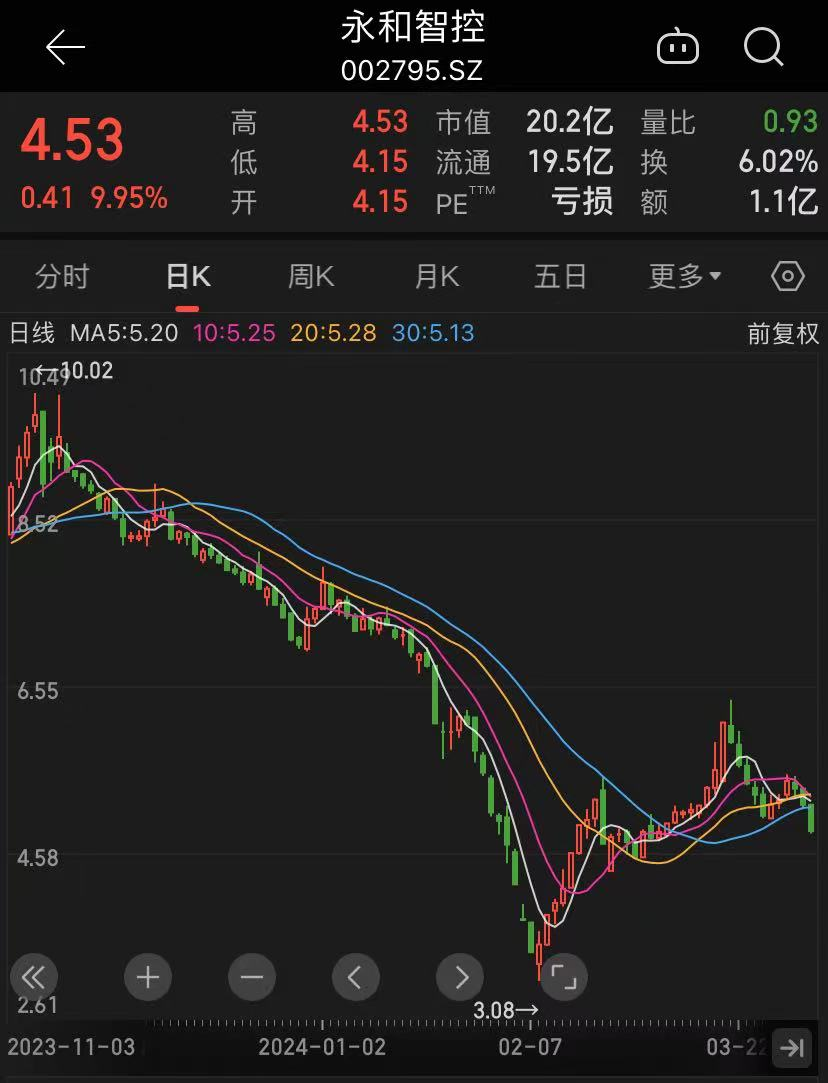 截至5月6日收盘,永和智控股价报4.53元/股,总市值20.2亿元。