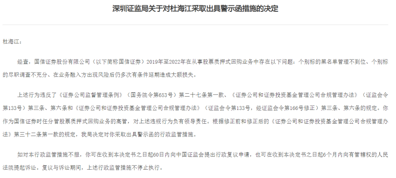 同日,国信证券副总裁杜海江也因个别标的黑名单管理不到位、个别标的尽职调查不充分等被深圳证监局出具警示函措施。