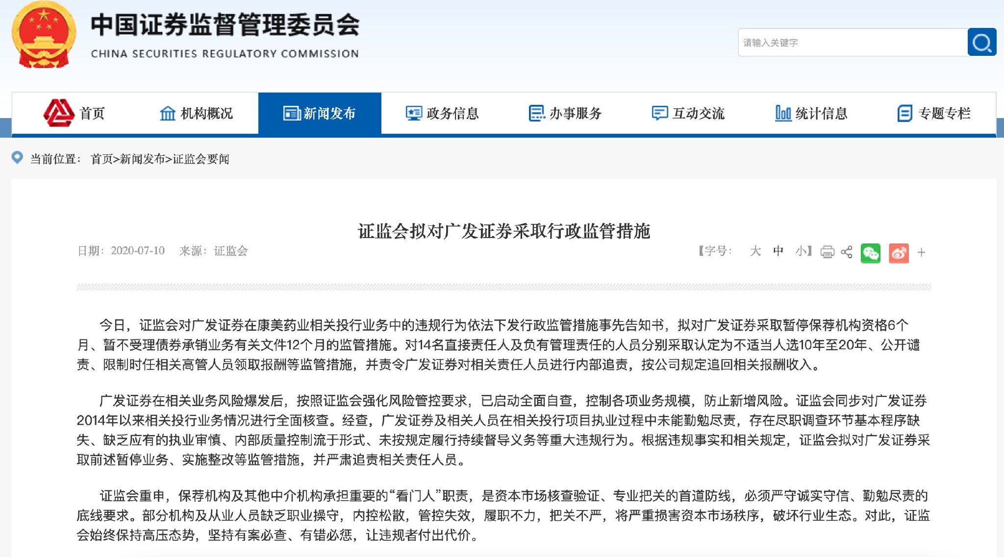 2020年7月,证监会对广发证券在康美药业相关投行业务中的违规行为依法下发行政监管措施事先告知书,拟对广发证券采取暂停保荐机构资格6个月、暂不受理债券承销业务有关文件12个月的监管措施;对14名直接责任人及负有管理责任的人员分别采取认定为不适当人选10年至20年、公开谴责、限制时任相关高管人员领取报酬等监管措施,并责令广发证券对相关责任人员进行内部追责,按公司规定追回相关报酬收入。