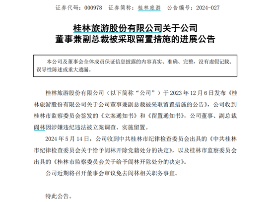 5月14日晚间,桂林旅游发布公告称,公司收到《中共桂林市纪律检查委员会关于给予訚林开除党籍处分的决定》,以及《桂林市监察委员会关于给予訚林开除处分的决定》。公司近期将召开董事会审议免去董事兼副总裁訚林相关职务事宜。