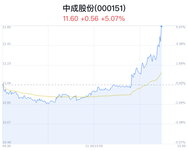 05月10日,中成股份(000151)股价大幅上涨,截至14点28分,中成股份上涨5.07%,报11.60元/股,创近3月新高,成交1.58亿元,换手率5.32%,振幅6.70%。