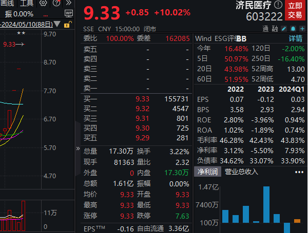 盘面上,济民医疗录得4连板,报9.33元,期间累计涨46.47%。