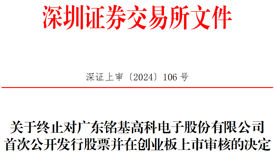 深交所于2023年5月26日依法受理了铭基高科首次公开发行股票并在创业板上市的申请文件,并依法依规进行了审核。日前,铭基高科向深交所提交了《广东铭基高科电子股份有限公司关于撤回首次公开发行股票并在创业板上市申请文件的申请》,保荐人向深交所提交了《国信证券股份有限公司关于撤回广东铭基高科电子股份有限公司首次公开发行股票并在创业板上市申请文件的申请》。根据《深圳证券交易所股票发行上市审核规则(20242年修订)》第六十二条的有关规定,深交所决定终止对铭基高科首次公开发行股票并在创业板上市的审核。