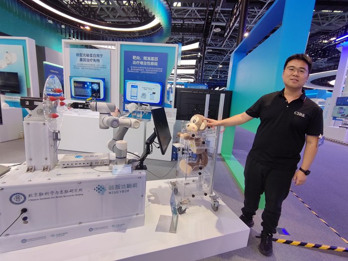 脑机接口,是大脑与外界设备沟通交流的“信息高速公路”,是新一代人机交互与人机混合智能的前沿技术,作为本次中关村论坛10项重大科技成果之一的“北脑二号”系统也在展示中心亮相。这款“北脑二号”智能脑机系统在国际首次实现了猕猴通过意念控制对动态目标的脑控拦截。在展品演示中,一只被绑住双手的玩具猴子,也可以用“意念”控制机械臂,成功抓住前面的草莓。脑机接口技术有望帮助脊髓损伤等造成的四肢瘫痪患者的运动功能替代和康复。据北京芯智达神经技术有限公司发展总监李园透露:“‘北脑二号’采用的是自主研发的高通量柔性微丝电极,它具有较好的生物相容性,极大降低对脑组织的损伤,确保信号长期稳定采集。”或许有一天,这样的脑机接口能够帮助瘫痪患者正常生活。