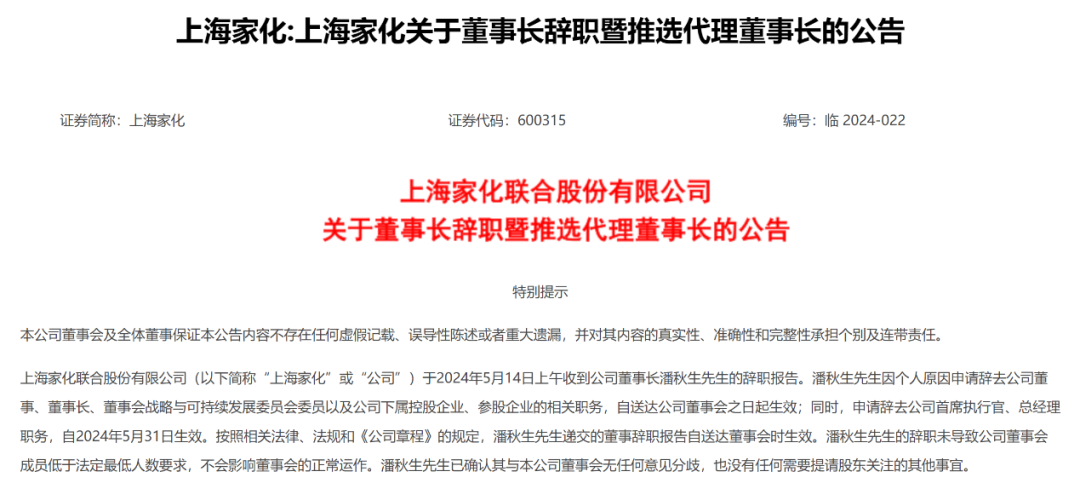 5月15日,上海家化发布公告称,当日上午收到潘秋生的辞职报告,因个人原因,潘秋生申请辞去公司董事长、首席执行官、总经理等相关职务。