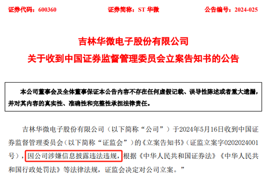 5月16日晚间,ST华微公告称,公司因涉嫌信息披露违法违规,当日收到中国证监会的《立案告知书》。