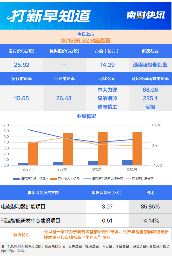 5月13日,瑞迪智驱在创业板上市,该公司是⼀家致力于高端装备核心部件研发、生产与销售的专精特新“小巨人”企业。