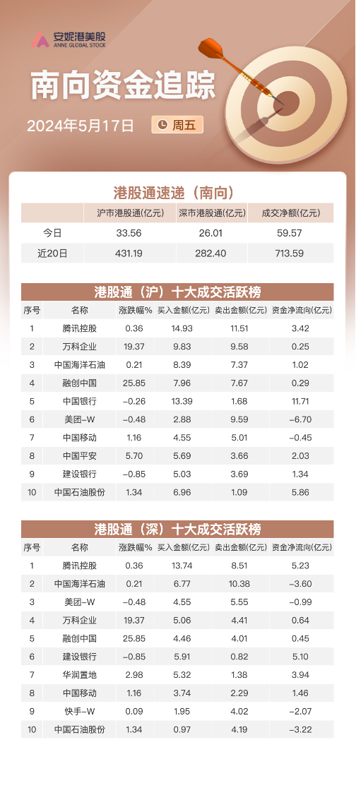 5月17日,南向资金当日成交756.44亿港元,净流入59.57亿港元。其中沪港股通净流入33.56亿港元,深港股通净流入26.01亿港元。