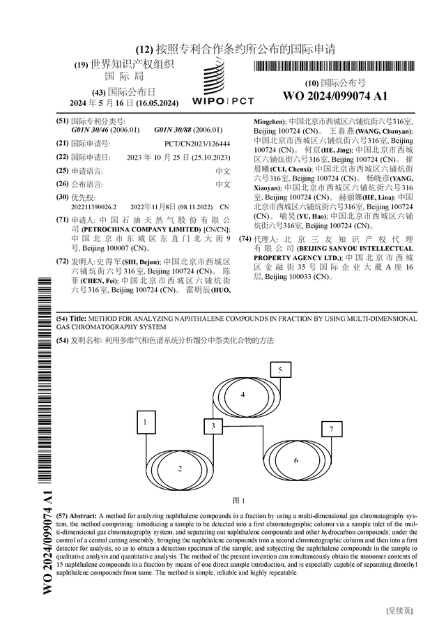 中国石油公布国际专利申请:“利用多维气相色谱系统分析馏分中萘类化合物的方法”