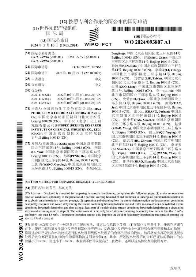 中国石化公布国际专利申请:“制备己二胺的方法”