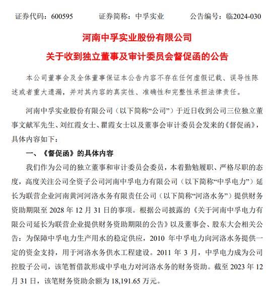 根据公告,这份督促函由公司独立董事文献军、刘红霞、瞿霞以及董事会审计委员会发来。函件高度关注中孚电力延长为联营企业河洛水务提供财务资助期限至2028年12月31日的事项。