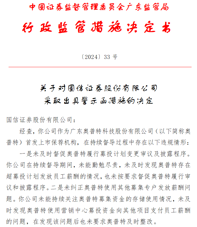 5月6日晚间,广东证监局发布了对国信证券采取出具警示函措施的决定。决定指出,国信证券作为奥普特首发上市保荐机构,在持续督导过程中存在未及时督促奥普特履行募投计划变更审议及披露程序、未纠正奥普特使用其他募集专户发放薪酬两大问题。这也是国信证券年内收到的第三张监管函。