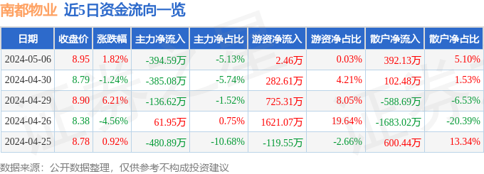 5月6日的资金流向数据方面,主力资金净流出394.59万元,占总成交额5.13%,游资资金净流入2.46万元,占总成交额0.03%,散户资金净流入392.13万元,占总成交额5.1%。