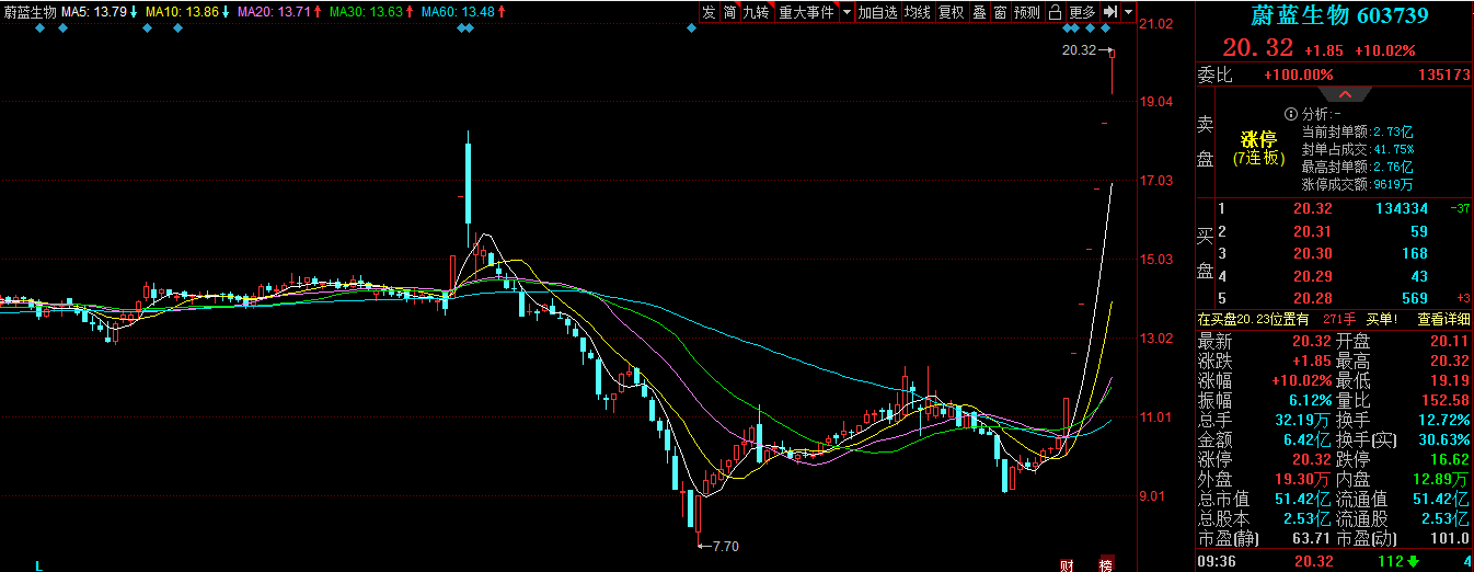 5月9日,蔚蓝生物高开,截至发稿,股价涨停,报20.32元,走出7连板。