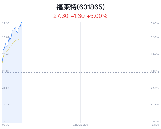 05月09日,福莱特(601865)股价大幅上涨,截至09点59分,福莱特上涨5.00%,报27.30元/股,成交1.38亿元,换手率0.27%。