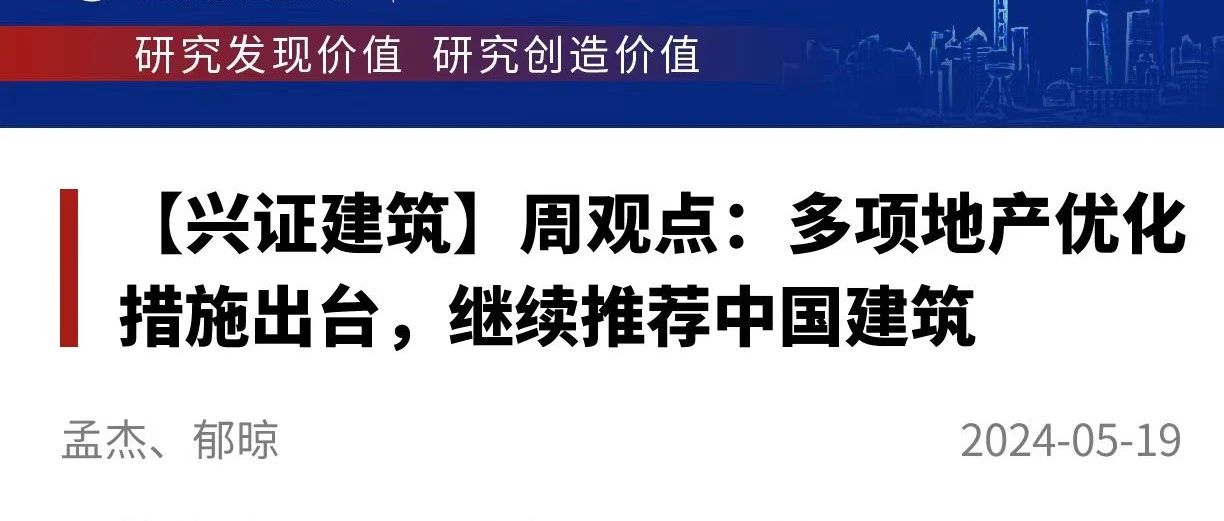 我们发布了《【兴证建筑】周观点:多项地产优化措施出台,继续推荐中国建筑》,欢迎阅读!