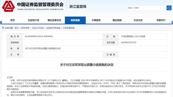 上述行为违反了《上市公司董事、监事和高级管理人员所持本公司股份及其变动管理规则》(证监会公告〔2022〕19号)第十二条的规定,浙江证监局决定对王忠军采取出具警示函的监督管理措施,并记入证券期货市场诚信档案。