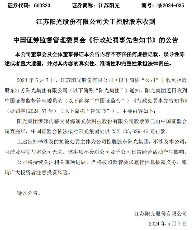 今日晚间,ST阳光公告,江苏阳光股份有限公司收到控股股东江苏阳光集团有限公司通知,阳光集团近日收到中国证券监督管理委员会《行政处罚事先告知书》(处罚字[2024]57号)。阳光集团涉嫌内幕交易海润光伏科技股份有限公司股票案已由中国证监会调查完毕,中国证监会依法拟对阳光集团处以2.32亿元罚款。