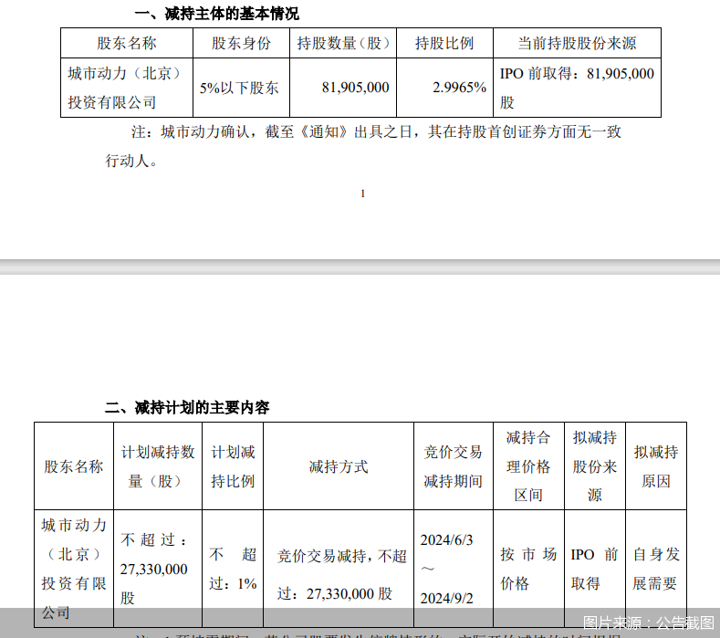 北京商报讯(记者 李海媛)5月12日,首创证券发布关于股东减持股份计划公告。首创证券表示,于5月11日收到城市动力(北京)投资有限公司(以下简称“城市动力”)出具的《城市动力(北京)投资有限公司关于首创证券股份有限公司股票减持计划的通知》,城市动力基于自身发展需要,拟减持所持首创证券A股股份不超过2733万股,计划减持比例不超过1%。在此次减持前,城市动力持有首创证券A股股份8190.5万股,持股比例为2.9965%。