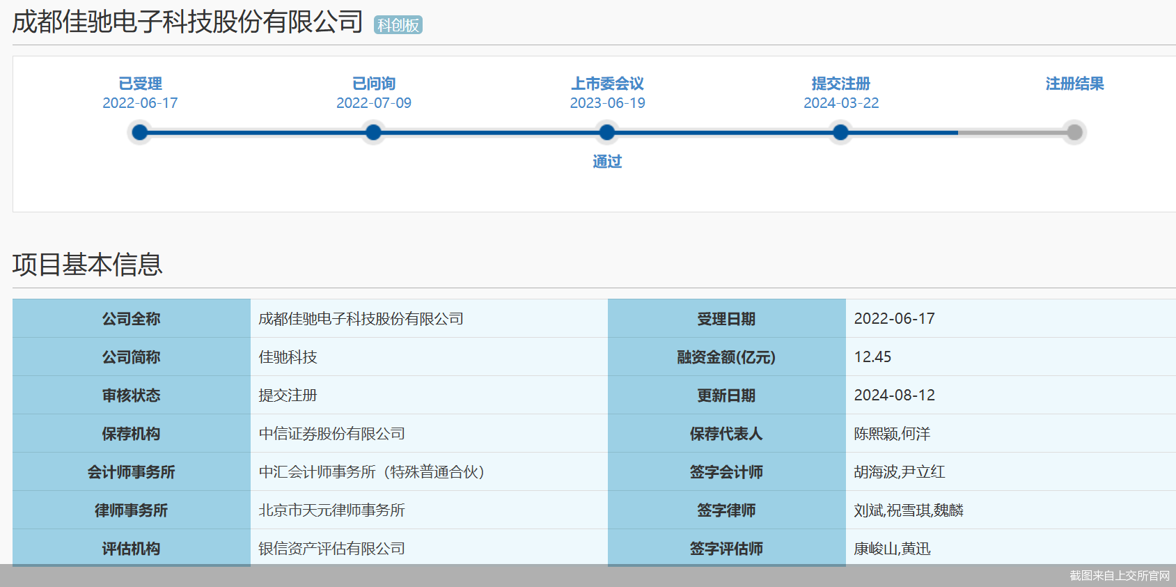 根据上交所官网,佳驰科技科创板IPO于2022年6月17日获得受理,当年7月9日进入问询阶段,于2023年6月19日上会获得通过,2024年3月22日提交注册。