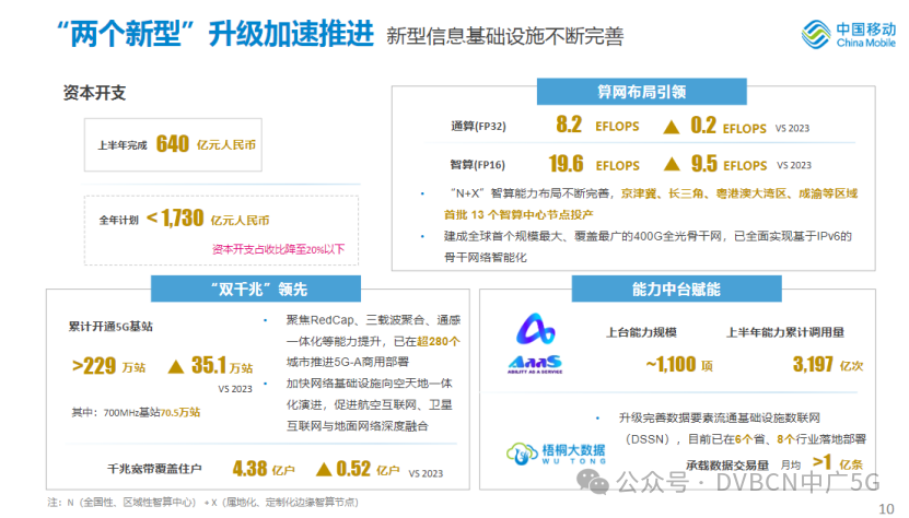 值得注意的是,中国移动在财报中对新基建建设方面提到,全力锻造5G网络领先优势,深入推进与中国广电共建共享,上半年5G网络投资共计人民币314亿元,累计开通5G基站超229万个,其中700MHz 5G基站70.5万个。率先启动5G-A规模部署,聚焦RedCap、三载波聚合、通感一体化等能力提升,目前已在超280个城市推进5G-A商用部署,年内将扩展至超300个城市;分场景精准建设千兆宽带能力,截至2024年6月底,全国市县城区100%、乡村97%以上具备千兆平台能力,千兆覆盖住户达到4.38亿户。