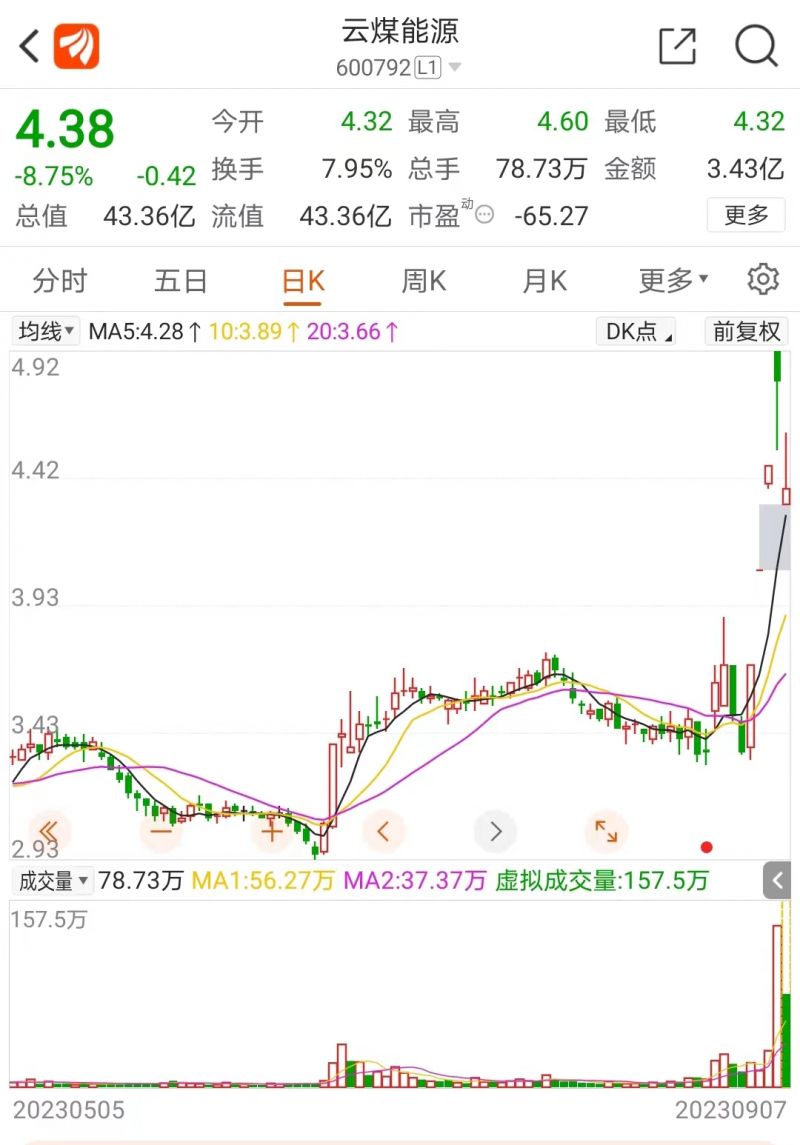 记者发现,在涨幅居前的个股中,云煤能源成为人气龙头,斩获4天3板,成交活跃,前三个交易日均涨停,第四日(9月6日)收涨7.38%,换手率高达13.72%,盘中最高价涨至4.92元/股,收盘价报4.80元/股,拉出了一条长长的下阴线。