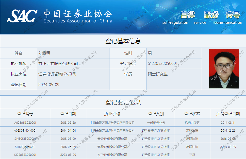 更早之前,中证协官网资料显示,2013年2月,刘章明进入上海申银万国证券研究所有限公司,并于2014年12月离职。