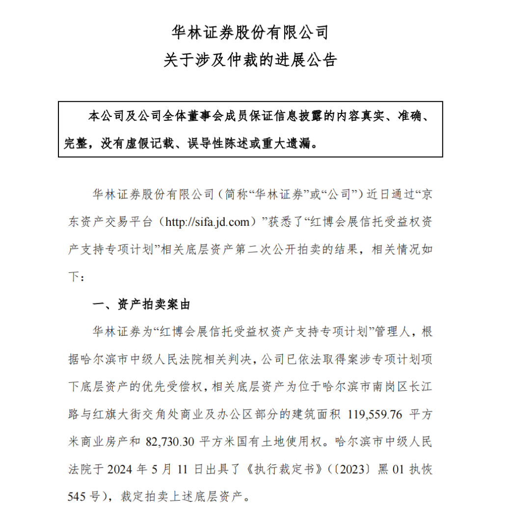 作为红博会展专项计划的管理人,华林证券已经启动专项计划项下底层资产的处置程序。相关底层资产为位于哈尔滨市南岗区长江路与红旗大街交角处商业及办公区部分的建筑面积119,559.76平方米商业房产和82,730.30平方米国有土地使用权。