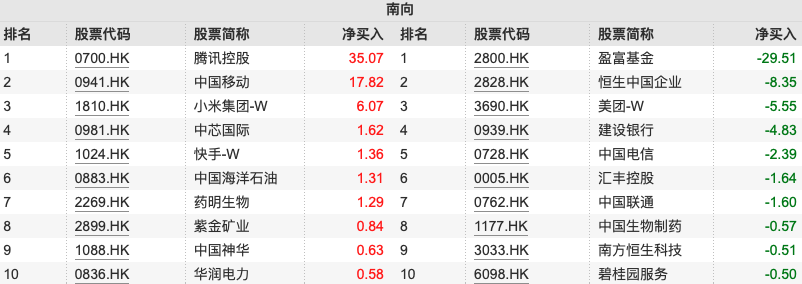 大幅净买入:腾讯控股(00700.HK)35.07亿港元;中国移动(00941.HK)17.82亿港元;小米集团-W(01810.HK)6.07亿港元。