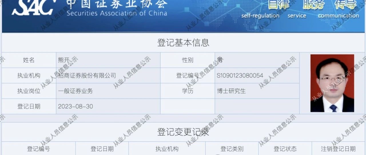 3 、查询招商证券公告,2023 年 8 月 29 日,招商证券董事会公告聘用熊开为副总裁,任期止2024 年 12 月 31 日,有意思的是,2023 年 8 月 30 日熊开被登记为证券从业人员。但查询所有公告和网络信息,都没有熊开为副总裁的时候主管什么的工作内容。