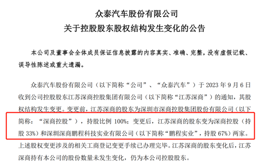 众泰汽车9月6日晚间公告,公司控股股东江苏深商控股集团有限公司(以下简称“江苏深商”)的股权结构近期发生变更,深圳深商鹏程科技实业有限公司(简称“鹏程实业”)成为持有江苏深商67%股份的大股东。江苏深商原本由深圳市深商控股集团股份有限公司(简称“深商控股”)全资所有,如今深商控股持股比例降至33%。