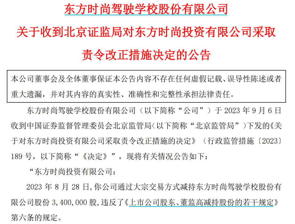 根据《上市公司股东、董监高减持股份的若干规定》第十四条的相关规定,北京证监局决定对东方时尚投资采取责令改正的监管措施。